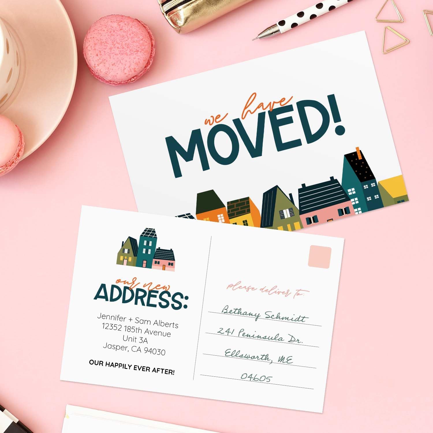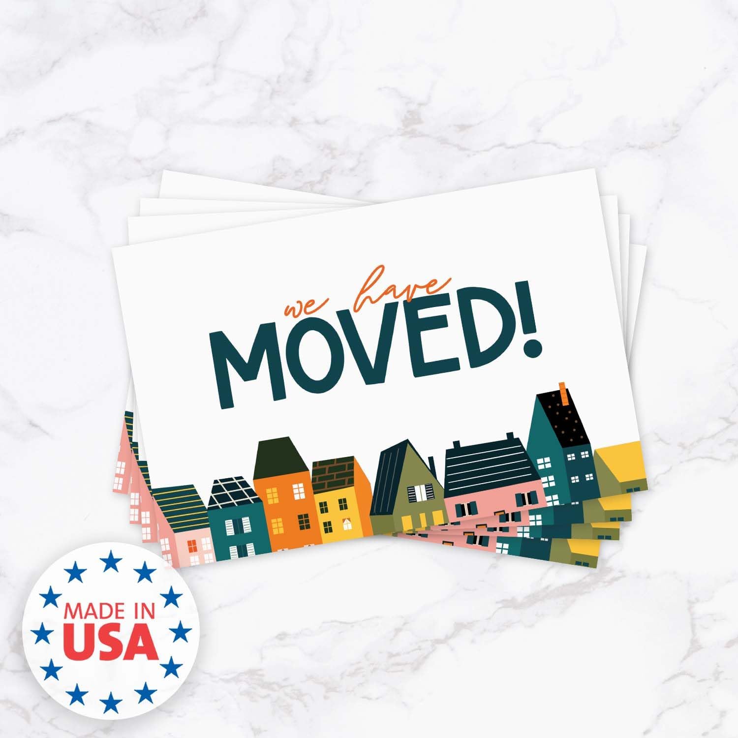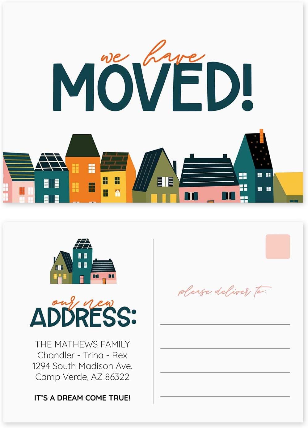 • Modern Design: Whimsical colorful town illustration with the words, “We Have Moved” and up to 5 lines for personalization to include new home address and a warm welcome! Printed on both sides of high quality cardstock.